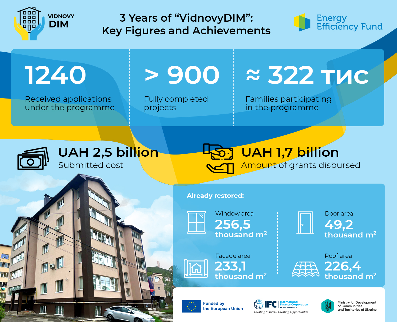 Under ‘VidnovyDIM Program, the EEF reimburses 100% of the cost of materials and works, up to UAH 10 million per building. This makes recovery accessible even to HOAs without their own savings.